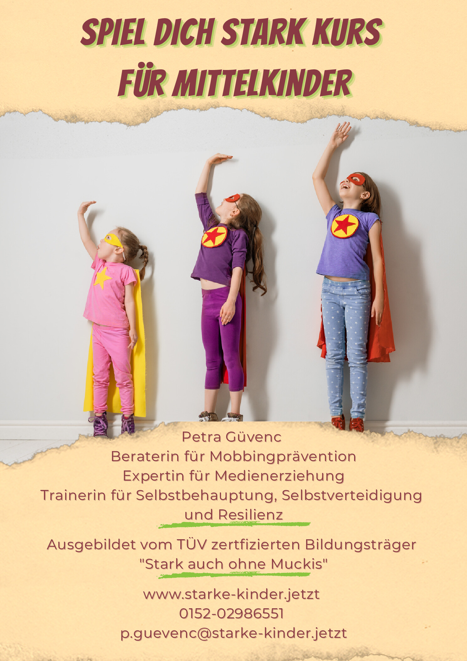 Der Spiel dich stark Kurs ist extra für jüngere Kinder konzipiert und richtet sich stark nach dem Entwicklungsstand und den Fähigkeiten der Kinder. Hier sollen durch spielerische Elemente die ersten Sozialkompetenzen, das Selbstbild und die Resilienz der Kinder gefördert werden.